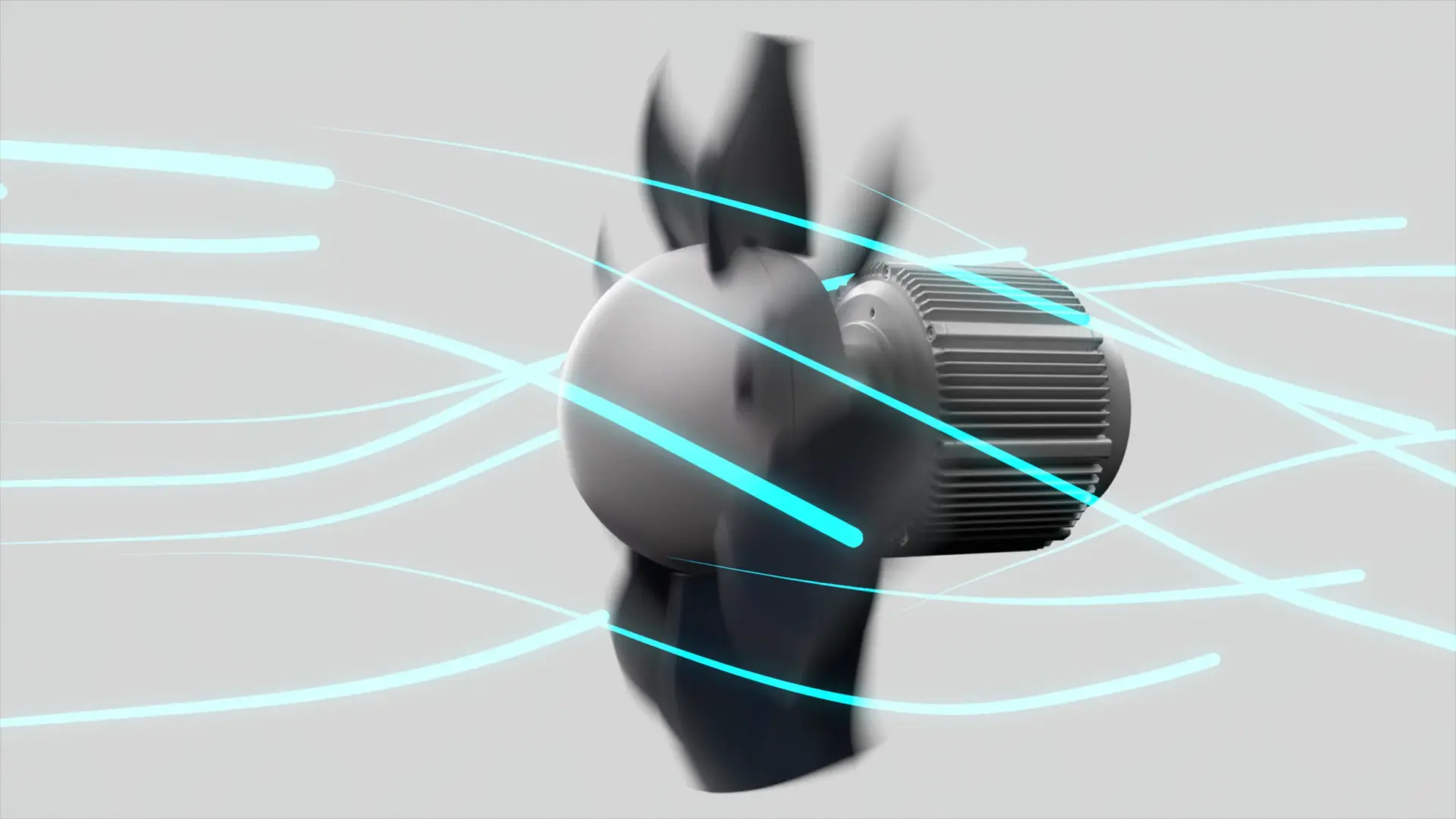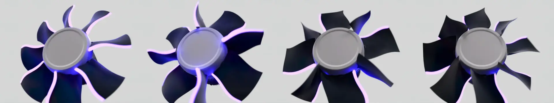 Conventional fans only change the direction of rotation during reversing operation and lose a considerable amount of power in the process. Our prototype combines 180° blade adjustment with aerodynamically optimized geometry. This means that the leading edge remains the same in both directions, efficiency is high and noise levels are low. The media-free, inertia-driven blade adjustment takes place almost at standstill. Ideal for integration into existing machine architectures. The cooling capacity can be precisely regulated or switched off completely if required. All this leads to higher efficiency, lower energy consumption and flexible application options.