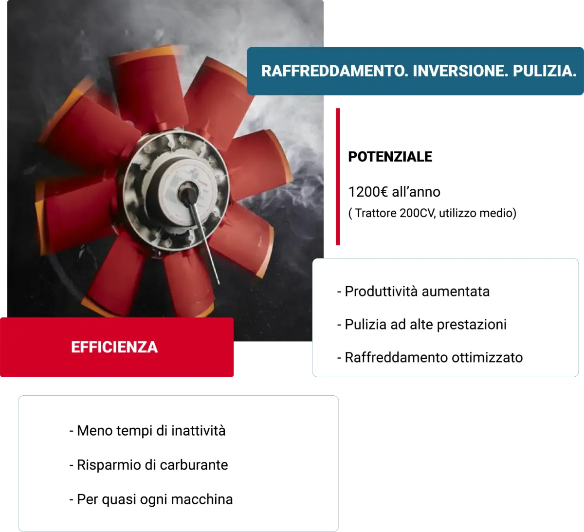 ... e anche di più! Con il ventilatore reversibile Cleanfix non solo ottieni il massimo del raffreddamento e una potente autopulizia, ma anche una tecnologia all'avanguardia fin nei minimi dettagli. Dai FlexTips per un flusso più voluminoso alle termocoppie per la regolazione automatica della capacità di raffreddamento e alle dimensioni personalizzate delle pale. Questo significa che la tua macchina funziona in modo più efficiente, richiede meno manutenzione ed è più sostenibile, indipendentemente dal luogo in cui ti trovi.