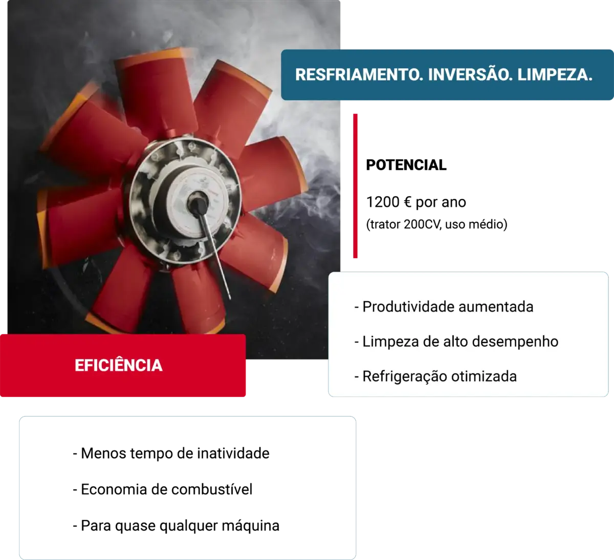 O ventilador reversível Cleanfix inverte completamente o fluxo de ar em segundos, graças à rotação automática de todas as pás para a posição ideal. Com o ventilador de auto-limpeza Cleanfix, os refrigeradores permanecem livres, as máquinas funcionam mais eficientemente, requerem menos manutenção e estão em uso durante mais tempo.