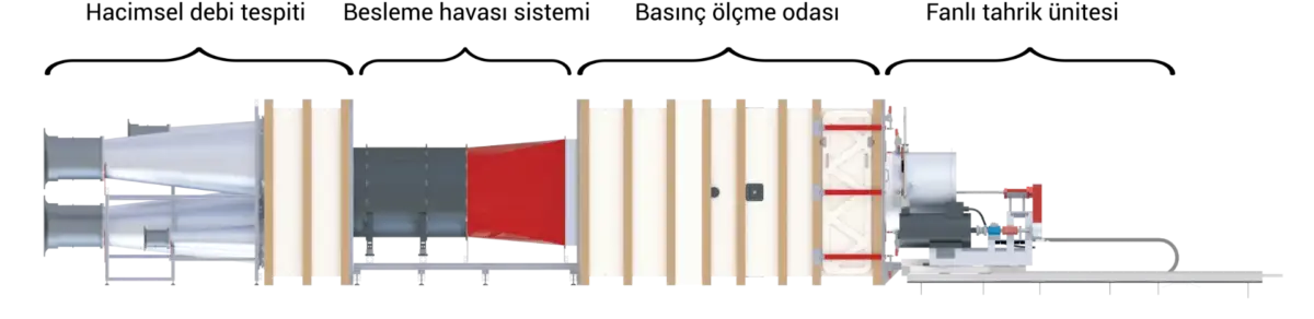 - Emiş tarafı hazne test düzeneği 14 metre uzunluğundadır, uluslararası standartları (ISO 5801, ANSI/AMCA 210-16) karşılar ve 300 mm’den 900 mm’ye kadar pervane çapına sahip eksenel fanlar için uygundur.